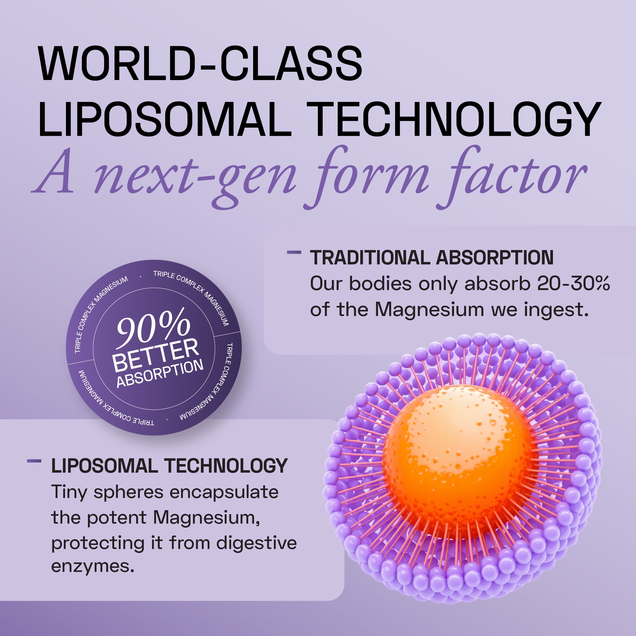 Magnesium absorption is typically poor due to factors like digestive enzymes and competition from other minerals. Ace Blend's Max Magnesium utilizes liposomal technology, significantly enhancing magnesium bioavailability and allowing for highest absorption into the body.
