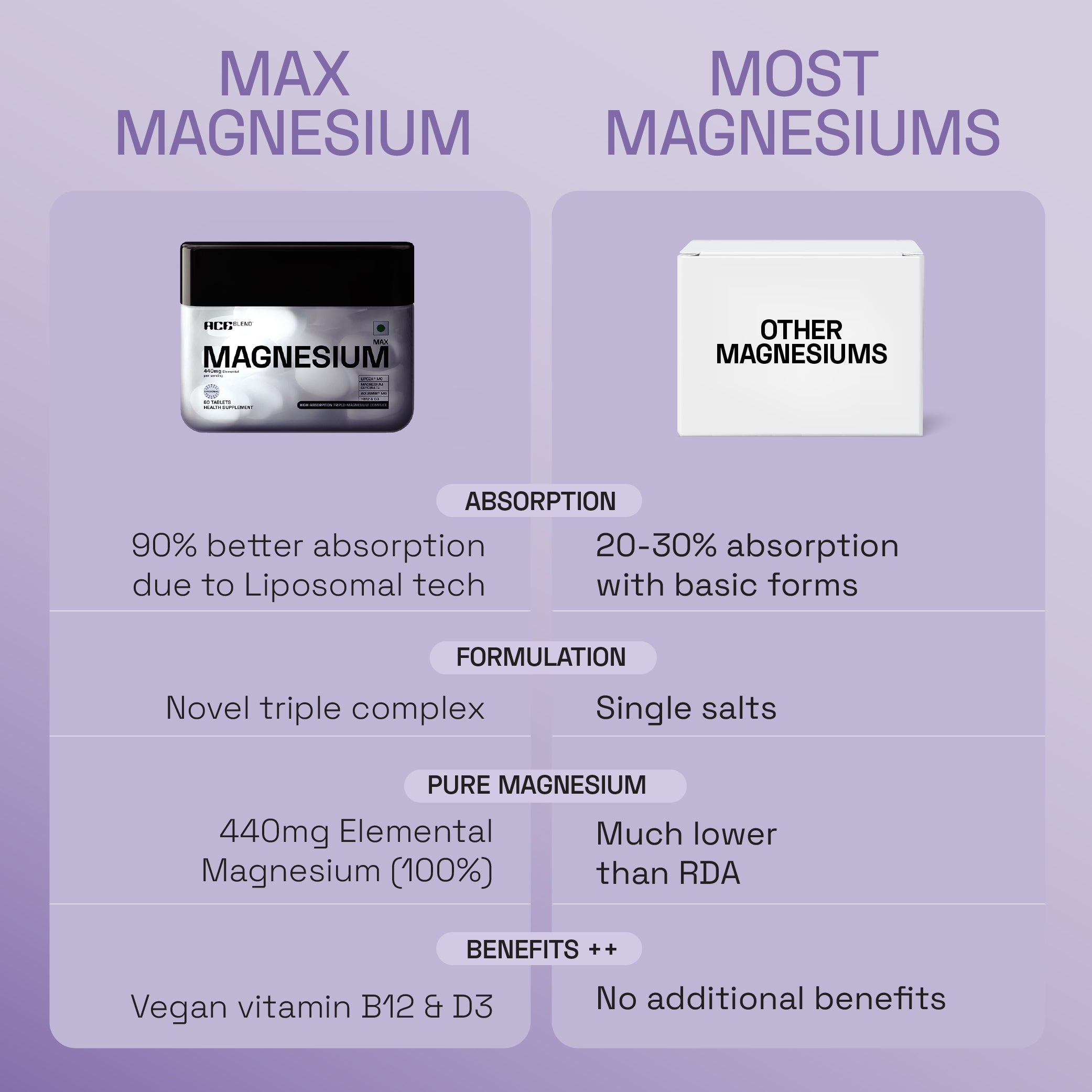 Magnesium absorption is typically poor due to factors like digestive enzymes and competition from other minerals. Ace Blend's Max Magnesium utilizes liposomal technology, significantly enhancing magnesium bioavailability and allowing for highest absorption into the body.